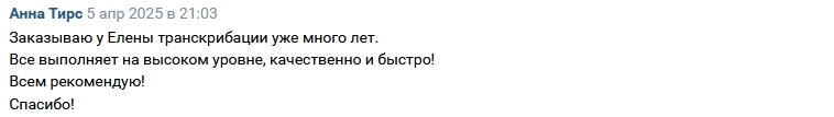 В наши дни отзывы заказчиков играют немаловажную роль в выборе исполнителя, в том числе и в выборе транскрибатора. Я трепетно отношусь к своей работе по расшифровке аудио/видео в текст и предлагаю вам ознакомиться с реальными отзывами моих заказчиков.